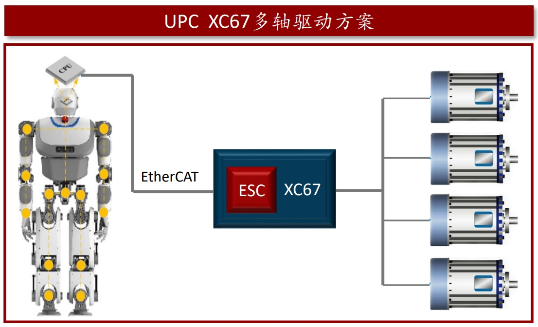单芯片4轴伺服方案,10颗芯片即可以完成机器人40个自由度的关节控制。相比单轴驱动方案,需要多达40个多伺服驱动系统才能完成40个自由度的机器人关节控制。